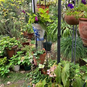 三連の鉄のパーテーションを三角にして鉢を吊している アイアン好きで園芸店の資材置き場は外せない。