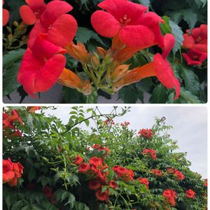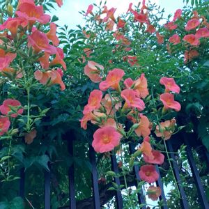 ノウゼンカズラが満開です🎵 夏らしくていいんだけれど、ポタポタ落ちるのがちょっと困ったものです😅 薔薇の上に落ちたらサッサと取らないとね😅