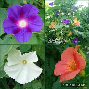 6/27(木)① 今朝の朝顔とノウゼンカズラ。 白は1輪、紫は6輪でした🤗🎵 昨日は朝イチで近場の温泉に行き、帰りに買い出ししてお昼には帰宅。 久々にお昼寝して気持ち良かったです🎶