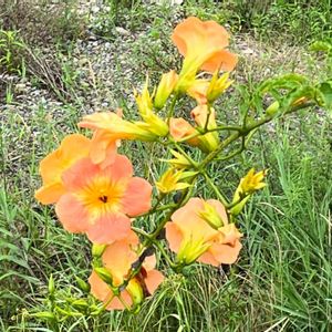 今日のお花♡.*゜ ノウゼンカズラ🧡✨ 実家の裏の河原に咲いていますが、崖の下なので 恐る恐る🤳して撮りました( ˊᵕˋ ;)💦