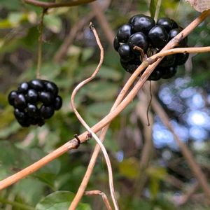 綺麗な果実が生っていました♪ シオデ(牛尾菜) サルトリイバラ科 シオデ属 つる性多年草 北海道、本州、四国、九州に分布 山野に生育 シオデは山菜としてしられている。 茎には稜があり、托葉が変化した巻きひげで、他ほものに絡みつく。 葉は長さ5〜15cm幅2.5〜3.5の卵状長楕円形。先は尖る。3〜7の平行脈がある。 雌雄異株。葉腋に球形の散形花序に小さな花を多数つける。 花は淡黄緑色、花被片6個で強く反り返る。 雄花は長さ4〜5㎜の披針形、雌花はやや短く長楕円形。 雄しべ6個。葯は長さ約1.5㎜、細く釣針状に曲がる。花柱は3個。 果実は直径7〜9㎜、球形の液果。 花期7〜8月 11月2日撮影 福島県南部
