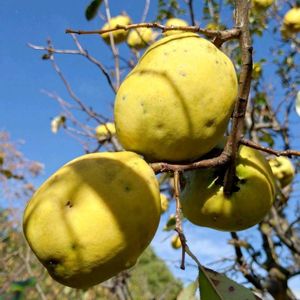 花梨(カリン) バラ科カリン属の落葉高木。中国原産の果樹で平安時代に渡来したとされる。緑色が入るまだら模様の樹皮が特徴。花期は4~5月。短い枝の先に淡紅色の5弁花を1つずつつける。秋に黄色く熟す果実は香りがよい。堅くて生では食べられないので果実酒やジャムにする他、咳止め薬に利用される。薬効効果が高く、『杏一益、梨二益、カリン百益』といわれる。よく似たマルメロは果実の表面を綿毛が覆う。 三味線の棹や胴は、主に熱帯アジア産のマメ科の花櫚(かりん)という輸入材によって作られている。この花櫚は『かろ』と言っていたが、音転して『かりん』となり、花梨の字を当てた。材は紫檀に似て、花模様もある。一方、本種も心材が花櫚に似るので、同名の『かりん』の名がついた。 出典『樹木の事典600種』『葉っぱで見わけ五感で楽しむ樹木図鑑』『樹木の名前』