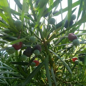 畑ガーデンとの境目の農道に植えられている木に可愛い実がなるのですが、 何という木なのか教えて下さい。 よろしく~😊🎶 追記 教えて頂き解りました。 イヌマキという木で、実が 食べられるのだそうです。😆👍✨ 名前入れさせてもらいました~。 ありがとうございました。🙇