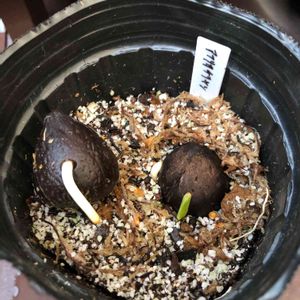 Jubaeopsis caffra アフリカチリヤシ ココヤシに似た耐寒性のあるヤシ。 ココヤシは、室内でも越冬が厳しいですが、こいつはマイナス5度くらいまで耐えます。 ただ今、種子が5個あり、1つ発根。 もう1つ発根の気配ありの状態です。 ただ、発根だけで半年くらいかかり、発根から2ヶ月経っても発芽がまだみられず、驚異の遅さ。 発根してから土に植えたので、生きているか確認できず、ヤキモキしています。