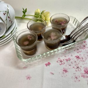 桜.黒蜜ゼリー 黒蜜と桜の二層ゼリー (八重桜の塩漬けは去年4/26漬けたもの) 友人からいただいたポテトスタンプで作った桜模様のふきん🌸 可愛いでしょう 添えたお花はクリスマスローズ