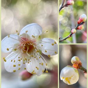 梅一輪🌸咲きました😍 我が家の小梅は、毎年早くから咲き始めます。お正月には「新春」を感じます💗 今年も、蕾をいっぱい付け始めたので 投稿しようかと、一番膨らんだ子を撮りました🤳 右下です。 次の日には、もう花開いて左の様に🌸 小梅なので、1センチくらいの小さな花ですが、この控えめな小ささが私は好きです💗 金曜日の蕾たちに参加させていただきます🥰