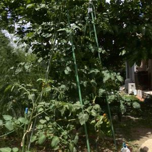 トマト二株、大きくなりました。てっぺんは支柱をこえてきたので切り取って伸びないようにしました。 手前のトマト苗はわき目をさしたもの。ちいさいですがスクスク育ってます。