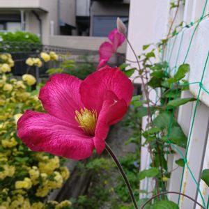 クレマチスの知識がない時に植えた ビルドリヨン💗 ✨ジャックマニー系✨ 新旧両枝咲き 強剪定 今までは鉄格子を登っていけなかったけど、去年ネットを張ってあげたら、体力使わなくて済むのか、元気に咲いてくれてます😲🙌 今までは初夏に1〜2輪だけだったんです 体力あるのか、ネットの無い鉄格子もぐんぐん登ってます もう写真も撮れない上の方まで行っちゃった オーイ ジャックと豆の木状態😲 花友さんとオソロのクレマチス🍒 ちょっとそれだけで嬉しい🎶