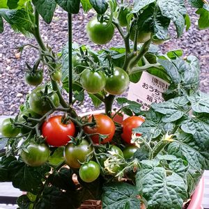 ☆ミニトマト🍅☆ 今年は、ミニトマトの苗3株、 プランターに2苗と1苗は、 鉢植えで育てています〜 やっと青い実が出初めました 早よ赤くなってねー😆🤭