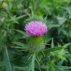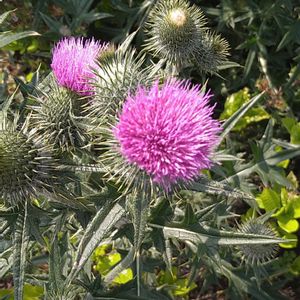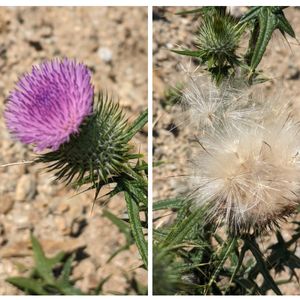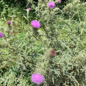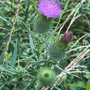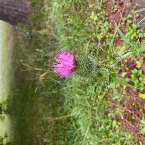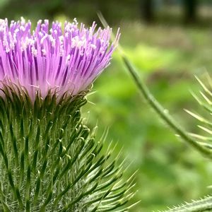 今日のお花 ✿アザミ アメリカオニアザミ 🌱キク科 アザミ属 ✽高さが50cm〜2mの二年草 ✽茎は全体に毛と鋭い刺のある翼があり、よく分枝する ✽茎葉は不規則に切れ込み、裂片の縁は切れ込みと鋭い刺が並び、裏面は白い綿毛が密生する ✽頭花は上向きにつき径約4cm、総苞は壺型、総苞片の先は鋭い刺となる 道端で綿毛が舞ってたので、何の綿毛?と思って辺りを見るとアザミでした! トゲトゲが凄くて、下手に近寄れないです😂