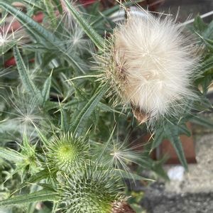 アメリカオニアザミです😱 我が街の田舎駅の入り口に咲いていました😱 危険ですので近づかないで下さい。 渋谷の商店街にも咲いてたけど、どうやって来たのか知りたいです。 靴の裏に種が付いたのかな🤔 綿毛がポワポワして飛んでいきやすいですね。