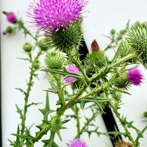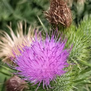 『アザミ』 🏷️今日のお花 マリアアザミ(ミルクシスル) オウシュウヒレアザミ 「ノアザミ」 マリアアザミ(Milk Thistle / 聖母マリアのアザミ) 🔸特徴 原産:南ヨーロッパ〜中東 葉に白い模様があり、「マリア様の母乳がこぼれた跡」との伝承から「マリアアザミ」と呼ばれています。 💐花言葉 「保護」「慈悲」「母の愛」 🧬名前の由来 キリスト教伝承:聖母マリアが赤ん坊イエスに母乳を与えていたとき、葉にこぼれて模様ができたという伝説。 💊薬効(現代ハーブ医学) 主成分:シリマリン 肝臓の保護作用がとても有名。 肝機能障害、肝炎、脂肪肝、アルコール性肝障害などにサプリメントとして広く使われています。 抗酸化作用・抗炎症作用も。 オウシュウヒレアザミ(欧州鰭薊 / ミルクシスル)も↑とほぼ一緒。 ノアザミ(野薊) 🔸特徴 日本原産の在来種。 初夏〜秋にかけて、紫紅色の花を咲かせます。 茎や葉にトゲがありますが、比較的やさしい印象の野草です。 💐花言葉 「独立」「報復」「厳格」 (アザミ全般の花言葉に準じます) 🐈猫には刺激物(トゲ)となるため、普通は避ける傾向がありますが、草を食べたがる猫もいます。 ノアザミには特別な毒性は確認されていません。 ただし、大量摂取やトゲによる口腔内の損傷には注意してください。 むやみに与えないで下さい。 💊薬草としての効能 葉・根:民間薬的に、健胃・利尿・止血に用いられることもあります。 昔の民間療法:若葉を揉んで、切り傷や虫刺されの腫れにあてるなど。 ⚠️ アメリカオニアザミ(アメリカ薊 / Bull Thistle)ここにはいません 🔸特徴 北米原産で、外来種として日本でも分布。 トゲがとても鋭く、葉・茎・ガクすべてにトゲが密生。 放置すると大繁殖する厄介な侵略的植物(雑草扱い)です。 ⚠️危険性 触れると皮膚を傷つけるほどの鋭さ。 牧草地や農地で繁殖すると駆除が困難。 毒性はないものの、家畜や人間には迷惑な植物。 種子の飛散力が強く、根も深くて再生力も高いため、根絶が非常に難しいです。 「美しいものには棘がある」と言いますよね。 まさにアザミはその体現。 トゲがあるからこそ、動物に食べられず、自然の中で生き抜く知恵を持っています。 🩷フランスでは「アザミ=騎士の花」 スコットランドでは国花であり、「敵の侵入を防いだ」という伝説もあります。 ⇒ 美しさと防衛本能が共存する、誇り高き花として敬意をもたれています。 トゲがあっても嫌われない、むしろそこに魅力がある——。 アザミは、本当の強さと美しさを教えてくれる野草なのかもしれませんね🍃 今日も暑い🥵です。 毎回、毎回 いい疲れました😓が、 命を守る行動を お願いします。(⁎ ᎑ˬ᎑)⁾⁾❤️🩹
