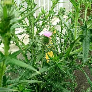 アザミです。 去年、小さな苗をもらって初めてうちで咲きました~✴ 鮮やかな色です🎵