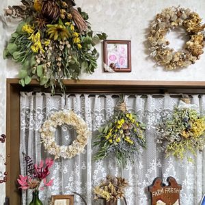 頂いたルリタマアザミを使いたくて庭からの紫陽花アナベルと天使のほっぺ、ユーカリポポラス、ドドナエアでスワッグを作りました💕 ルリタマアザミは茎が短めだったのでワイヤー使用の為ブドウ状態😅💦 ちょっとイメージ違うけれど今年はこれで行ってみよう〜😊