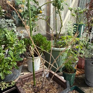 ティーツリー、枯れ枝を剪定しました 向こう側にミニトマトがあったりして見分けにくいですが、すっきりした なんと緑のちっちゃい葉が出ており復活の兆しがあります