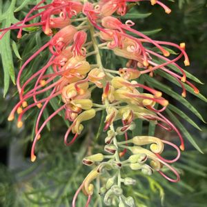 定位置から 8月になりましたね〜暑っ🍉🏝️ グレビレアとカリステモンピンクシャンパンと アカシアデアネイは暑さに負けずたくさん咲いてくれてます♫ あ、あとファンフラワーも咲いてます🪭