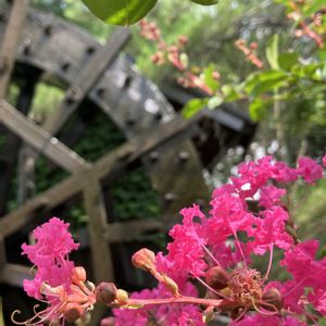 水車小屋の前に今日のお花💕 ➡️滝のしぶきが涼しそう🩵