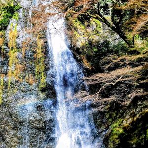 日本の滝百選のひとつ 大阪府箕面市の箕面大滝に行ってきました。 高さ33m幅5m 水しぶきで虹がかかっていました。 阪急電車箕面駅から2600メートル徒歩40分のやや登り坂で滝から流れる箕面川沿いの道は舗装されていて歩きやすい。モミジやサザンカや低山風景もきれいです。