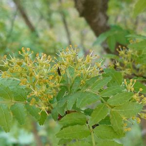 「サンショ(山椒)」 雄株 ようやく花が咲いた。 若葉を触ると、柔らかい山椒の良い香りがした。 別名:ハジカミ(椒) 🌺言葉:健康、魅惑、好意 2020.4.19