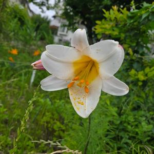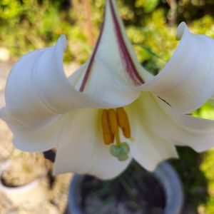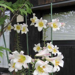 昨日、気の早いリーガルリリーと出会いました。 リーガルリリーは中国原産の野生種で主に四川省の高地に自生するトランペット形のユリです。 1903(明治36)年に英国人のプラントハンターE.H.ウイルソン氏によって発見され、その後、ヨーロッパに持ち込まれてオーレリアン・トランペット・ハイブリッドの交配親として多用されています。 日本には1923(大正12)年に紹介され栽培が容易なこともあり広く知られるようになりました。 花びらの内側の喉部に黄色い模様が入ることから和名ではオウカンユリ(王冠百合)と言われています。 『🏷️太陽がくれた季節a』 『🏷️白輝美人』 『🏷️2024年櫻鐵ユリコレクション』