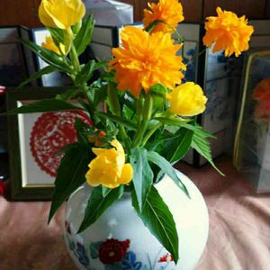 😅またまた例の男性(推定年齢78歳)から頂いたお花 オレンジ色のはヤエヤマブキですよね⁉️ もう1方の黄色いお花は何でしょう⁉️ ご存知の方は教えて下さい🐈 宜しくお願い致します🙇