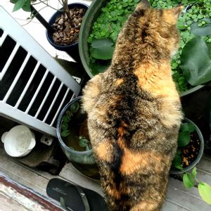 睡蓮鉢の水を飲む猫