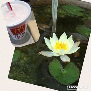 うひょ〜今日も暑い〜😲 夏休みの連休中な園芸店の前にあった姫睡蓮が寂しそうに咲いていた〜 見てくれる人が少なくて残念ね😢 5〜6cmのお花が爽やかで可愛い💕 じっくり見ていたら横には蕾もあった〜♪ そして暑いからピーチシェイク🍑飲んじゃった😁