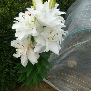 百合?カサブランカ?1本の茎に、八重なうえ花がいくつ付いてるんだろう。 なんかすごい😮 農園の端に 1本だけ植えてありました。