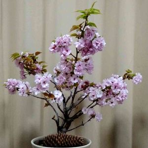 【仙台・観察日記】 ~奈良の八重桜~ 夜、室内でも、八重桜を楽しんでいます。 鉢に、長さ17cm のドイツトウヒの実を置いてみました。 八重桜が大きいことをお分かりいただけるでしょうか。 室内で見ると、大きく成長してくれたことがよく分かります。 真冬の間、寒いベランダで過ごしていた裸ん坊の姿を見ていただけに よくぞ、ここまで美しく花を咲かせてくれたなぁ~と感動しています!