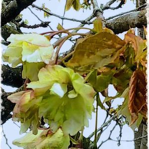 御衣黄桜💚 後ろの🍁モミジも良い感じに芽吹いてます💕