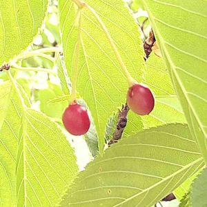 【仙台・二人仲良く~🍒】 散歩していたら 桜の木に、かわいいさくらんぼが赤く熟していました🍒 佐藤錦のさくらんぼと比べたら小さく、甘味は分かりません。 おそらく🐤さん用でしょうか。 私にとっては 街路樹の桜の木でにさくらんぼ🍒を見られるだけでも、とてもうれしいです(^_^)/~