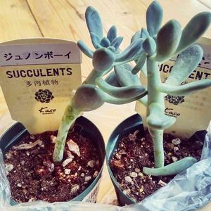 ポイポイプランターの手前の子。 葉っぱを挿したら順調に育っていますが名前が?? わかる方教えてください🙏 奥のジュノンボーイ葉挿しは ぐんぐん育って 残ってる親葉までプリプリになってるんだけど そんなことある??(笑)