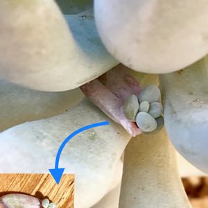 朝から陽射しが強すぎる中(×_×;) パトロールをしてると👒 ジュノンボーイの葉と葉の間に👀✨ 誰かの葉挿しっ子が成長してる( *´艸`) そっとピンセットで取り出すと うん❣️グッ! ( *˙︶˙*)و これならこのまま成長しそう💓