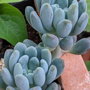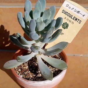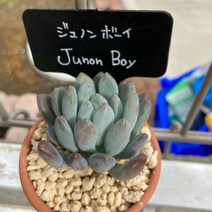 おはようございます😊 謎多肉 ジュノンボーイ このぷくぷく感はグラプト系? それともお粉感はコチレドン? GSの皆さんのpicだと冬の紅葉も 締まってキレイそうなので 秋になったら寄せ植えに使おうっと😲