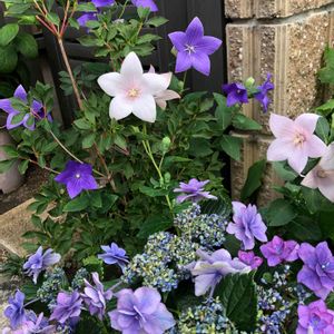 今朝の我が庭の紫コーナー💜 桔梗がまだ背の低いドウダンツツジの後ろからスクスク、紫陽花とのコラボです💕 ピンクの桔梗がアクセントになっています🥰