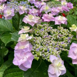 仕事の帰り道のお寺さんの傍らに咲いていた、ピンクのガクアジサイさん。(´∀`*)