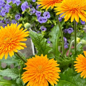 スッキリしないお天気が続いていますが ガーベラとトレニアが💛💜 やる気満々な咲きっぷりになりました🙌 たまーにガーベラの真ん中にいも虫がムシャムシャしながら昼寝💤🐛 割り箸でつまんでる感触も気持ち悪い👎🥴 来ないでくれ〜😵💫
