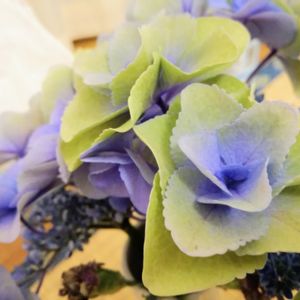 アジサイ「フェアリーアイ」の一輪挿し。贅沢な仕立て方だけど、良い色になってきました!