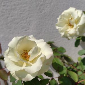 ①バラ「しずく」など白バラが久しぶりにきれいに咲いてくれたので、夕方にアレンジしました。 ②バラ 「しずく」 ③バラ「エミルドゥフォレ」と「しずく」を寄せ鉢に。 ④⑤今朝作った奥のバスケットのアップ