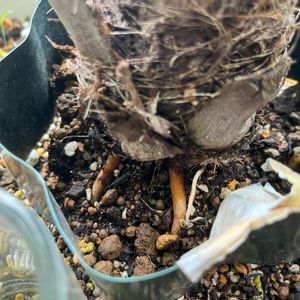 アメリカアブラヤシ 根元の周りを囲って中に土を入れてました。 ちゃんと根が出てきてくれていて安心^^