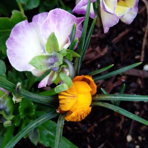 こんばんは🌝 パンジーの鉢に埋め込んでいたクロッカスの球根 いつのまにか顔を出していました🥰
