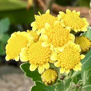 今朝のお花 ① ユリオプスデージー 別名 黄金菊(コウキンキク) ② マーガレットコスモス 別名 イエローエンジェル どちらもキク科ユリオプス属の低木 花だけをても見分けがつきません カーポート下にて 25.12.04