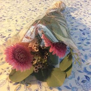 medeluアレンジ その2 テーブルコーディネート風にしてみました🧚♀️ 葉っぱの入れ具合が今ひとつですが、椅子に腰掛けると、どの角度からも花が💐見えるので、良しとします👍 花壇の我が家バラ🌹ちゃんも2輪ほど紛れていまーす😋