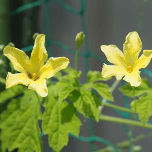 ゴーヤと黄色い花の葉 熱帯アジア原産のウリ科 別名 ツルレイシ