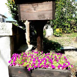 炎天下の中でも、もりもりのカリブラコア。 去年主人に作って貰った、プランター付のポストの引き立て役です。 支柱は、庭木を伐採した時の材木、その他再利用の廃材を工夫して作ってくれました。 大雨の時は、少し雨漏りしますが…😁