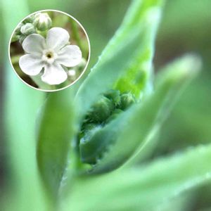 先月¥50で小さな苗を買った オンファロデス・リトルスノー せっかく1つ咲き始めたのに… 上の蕾に押しつぶされちゃってる😅
