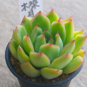 木染月、今回唯一名前買いした子😅 姿も可愛いです。爪の赤と縁のうっすら白く抜けているあたりが。 この子は顔違いがけっこうあって、もっと緑の濃いぎゅっと詰まったタイプと、明るいグリーンのふわっとした子がいました。 悩んで明るいタイプを。 育て方や環境で違う雰囲気になっていくのかもしれないです。