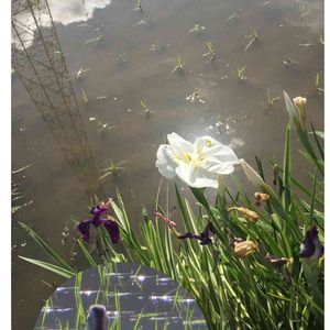 田んぼの隅っこに植えてある花菖蒲 雲と空と鉄塔が映った田んぼで餌探し中の🦆