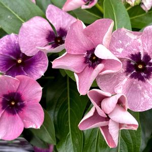 ニチニチソウ こぼれ種の皆さんの一部です。 💜モネアンティーク 🖤ポルカドットブラック 💗茜花火 それぞれ3.5〜4号のスリット鉢に植えてありますが、もうサイズ限界。水切れが激しいし、頭が重いから倒れちゃう。 暑いから植え替えしたくないし🥵 とりあえずチョッキン✂️しますか。 今年種がよくできているのは、ポルカドットブラック、茜花火、月明り、ミラ ストロベリーアイスです。
