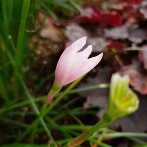 ゼフィランサス(白)の開きかけって薄ピンクで可愛いな😃 って前のお花、食べられちゃってるんですけど!😵